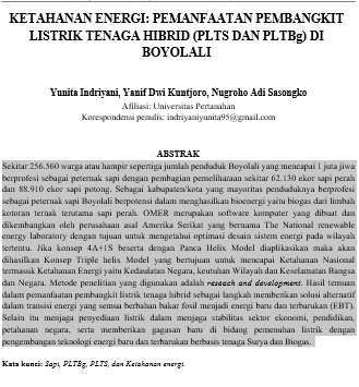 KETAHANAN ENERGI: PEMANFAATAN PEMBANGKIT LISTRIK TENAGA HIBRID (PLTS DAN PLTBg) DI BOYOLALI